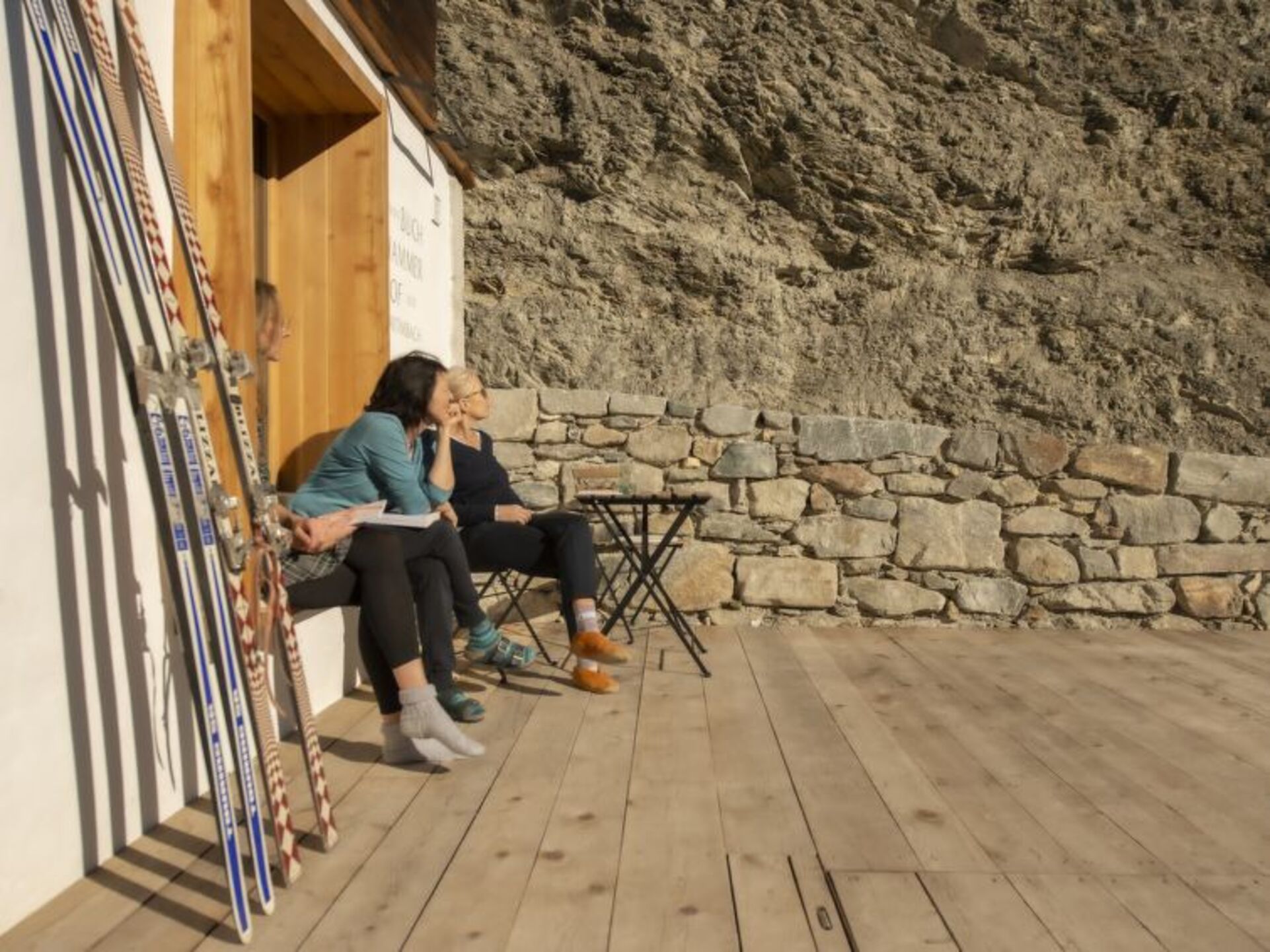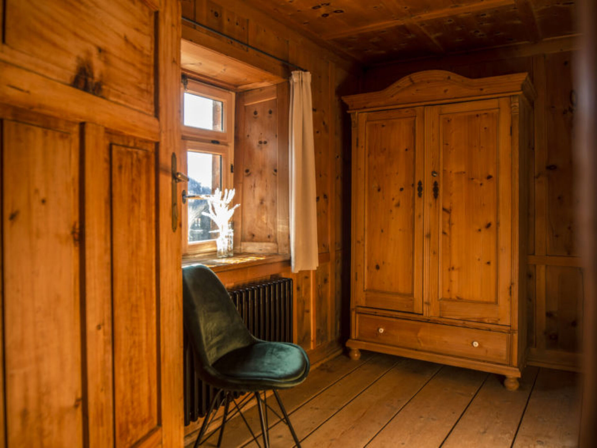 "[5startitle]", 2-room apartment 60 m2, on the ground floor. Rustic and wooden furniture furnishings: entrance hall. 1 double bedroom. Living/sleeping room with 1 sofabed (70 cm, length 180 cm), tiled stove. Large kitchen (4 hot plates, oven, dishwasher, toaster, kettle, microwave, electric coffee machine) with dining nook. Bath/shower/WC. Underfloor heating. Wooden floors. The living room is a farmhouse lounge. Terrace 30 m2, east facing position and south facing position. Sitting area. Marvellous view of the mountains. Please note: non-smoking house. Animals are not allowed. There is deliberately no TV in the apartment - only in the common lounge!