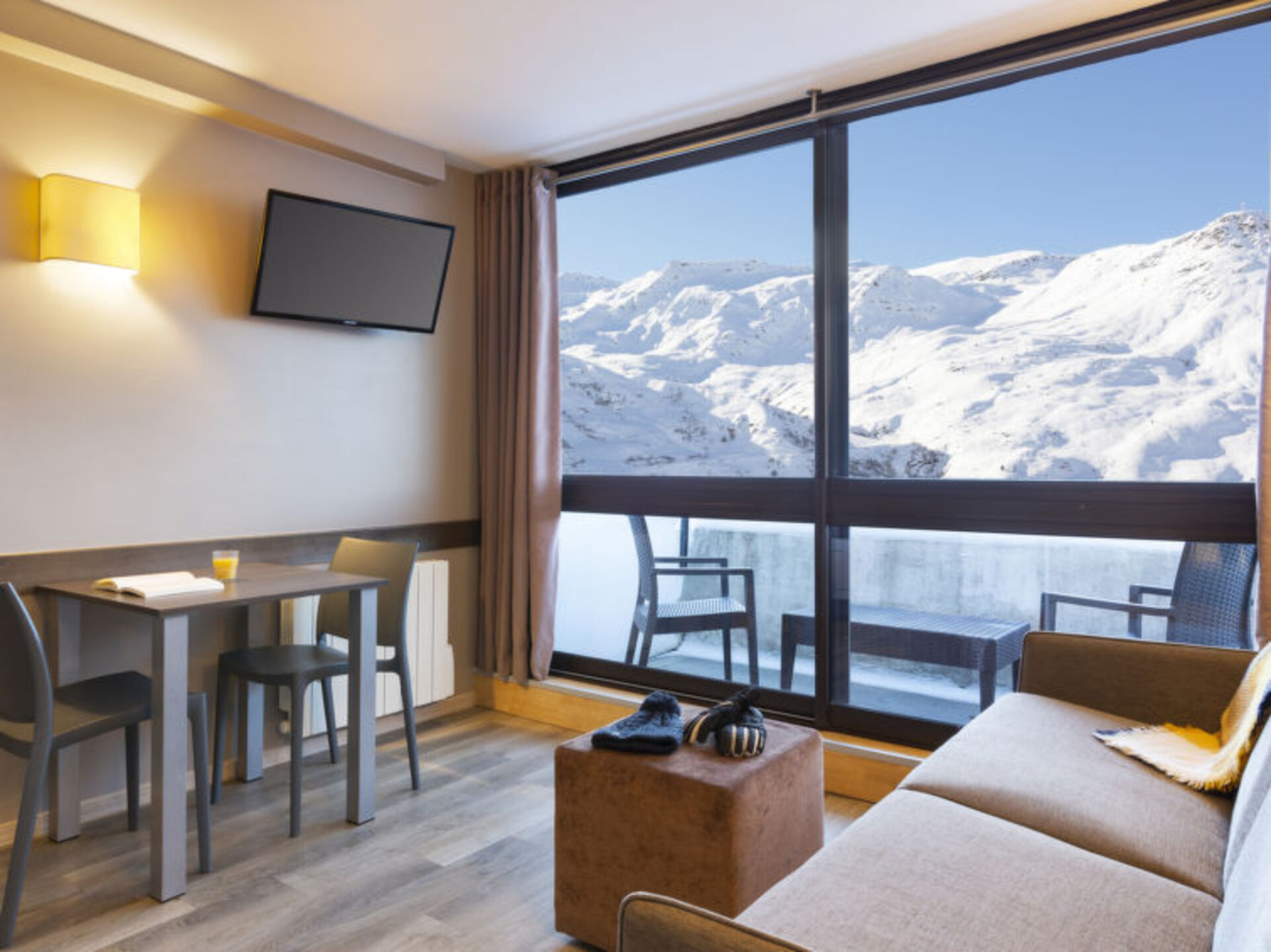 "Auvergne-Rhône-Alpes 1184", 1-room apartment 20 to 23 m2. Cosy furnishings: living/sleeping room with 1 bed, 1 double sofabed, dining table and satellite TV. Exit to the balcony. Kitchenette (dishwasher, 3 ceramic glass hob hotplates, toaster, kettle, electric coffee machine, combination microwave). Bath/WC or shower/WC. Electric heating. Balcony. Facilities: safe, hair dryer. Internet (WiFi, free). Offer by a commercial proprietor according to  Art. 155, IV, CGIResidence "Auvergne-Rhône-Alpes 1184", 1'850 m a.s.l.. 38 apartments in the residence. Above Les Menuires, in the district of Brelin, 10 m from the skiing area. For shared use: indoor pool (6 x 2 m, seasonal availability: 01.Jan. - 31.Dec.). In the complex: reception, shopping facilities, lift, storage room for skis. Chair lift, gondola lift 100 m, slopes 10 m. Well-known ski regions can easily be reached: Les 3 Vallées 10 m. Please note: the photograph shows a typical example. The holiday properties may differ in living space, floorplan, equipment and furnishing. Access to the center of Les Ménuires (la Croisette) located approx. 200 m by gondola.