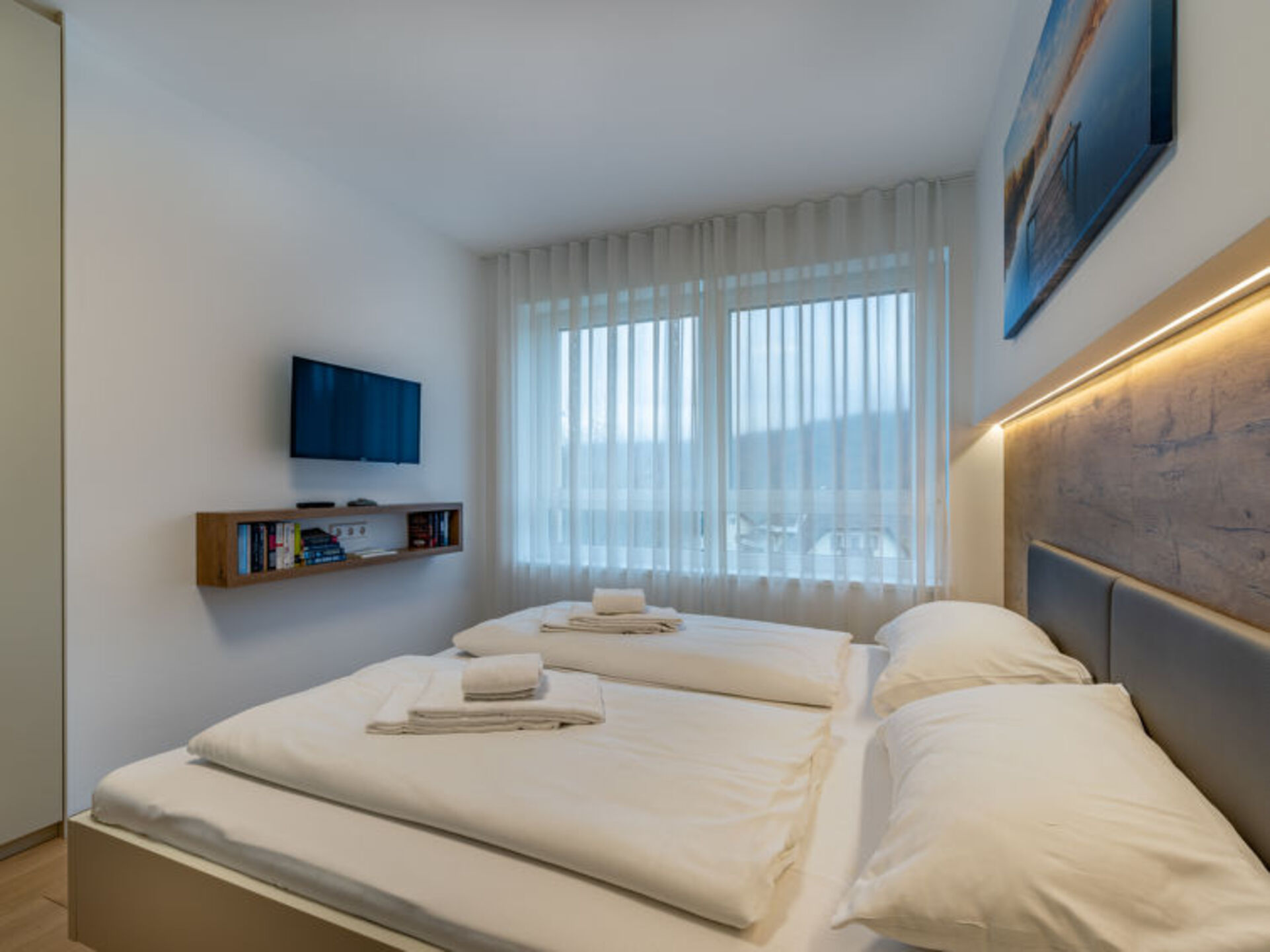 "[5startitle]", 3-room apartment 79 m2 on 1st floor. Bright, very modern and tasteful furnishings: entrance hall. Living/dining room with dining table and satellite TV (flat screen). Exit to the balcony. 1 room with curtain with 1 x 1 bunk beds, 1 double bed, shower/WC and TV. 1 room with 1 x 1 bunk beds, 1 double bed, shower/WC and satellite TV (flat screen). Open kitchen (oven, dishwasher, 4 ceramic glass hob hotplates, toaster, kettle, microwave, electric coffee machine, Capsules for coffee machine (Nespresso) extra). Parquet floors. Large balcony 20 m2. Balcony furniture. Very beautiful panoramic view of the lake and the mountains. Facilities: mosquito net, hair dryer. Internet (WiFi, free). Reserved parking space n 18 + 17 (roofed, 2 cars). Electric vehicle charging station. Please note: non-smokers only. Smoke alarm.