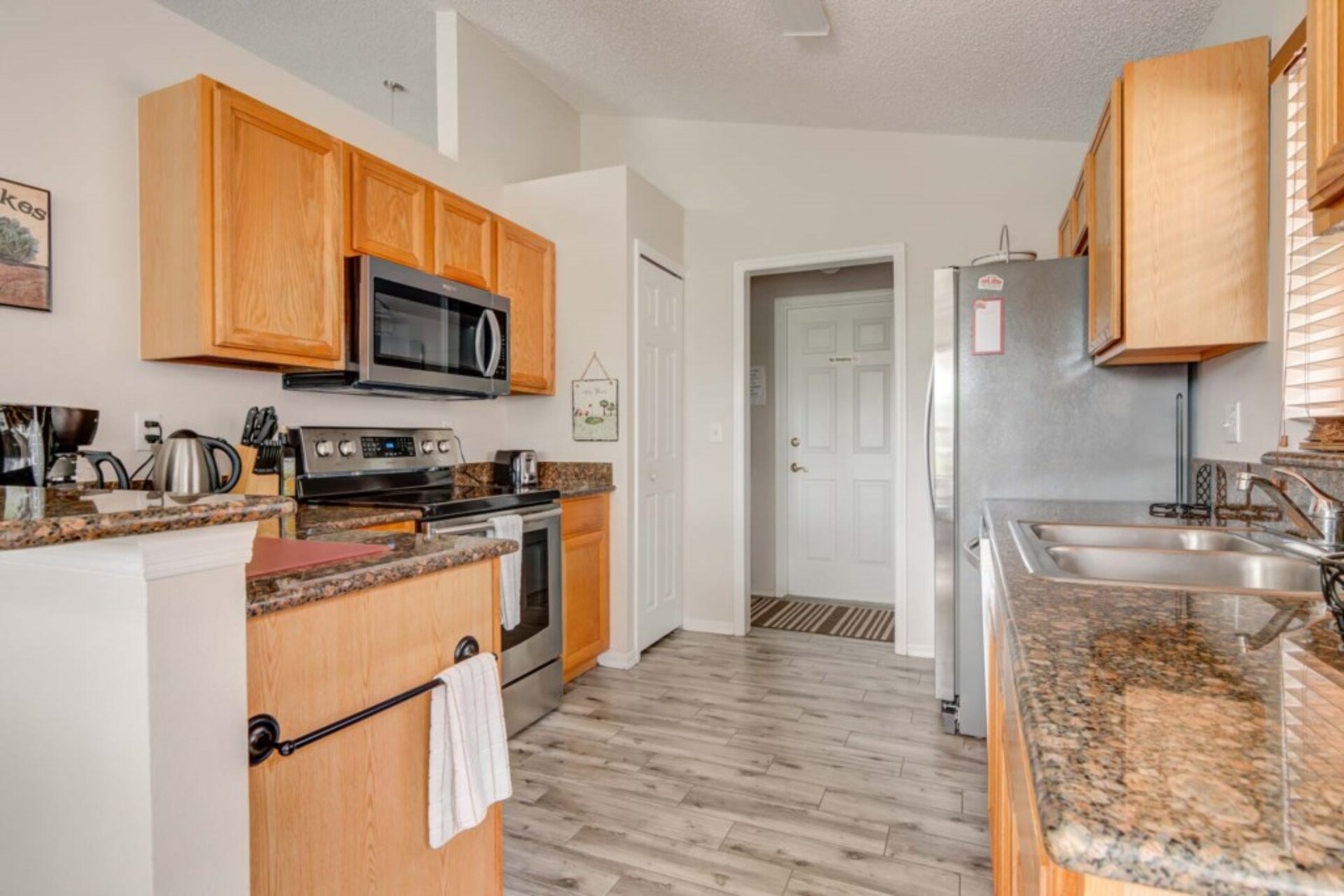 The eat-in kitchen has been updated with granite countertops and new stainless steel appliances. There is also a dining table that will seat up to 6 people and a cute little window seat that can be used as a quiet reading nook. The living room has a comfortable new sofa and loveseat set, which will seat 5-6 people, and a flat screen TV and DVD player.
