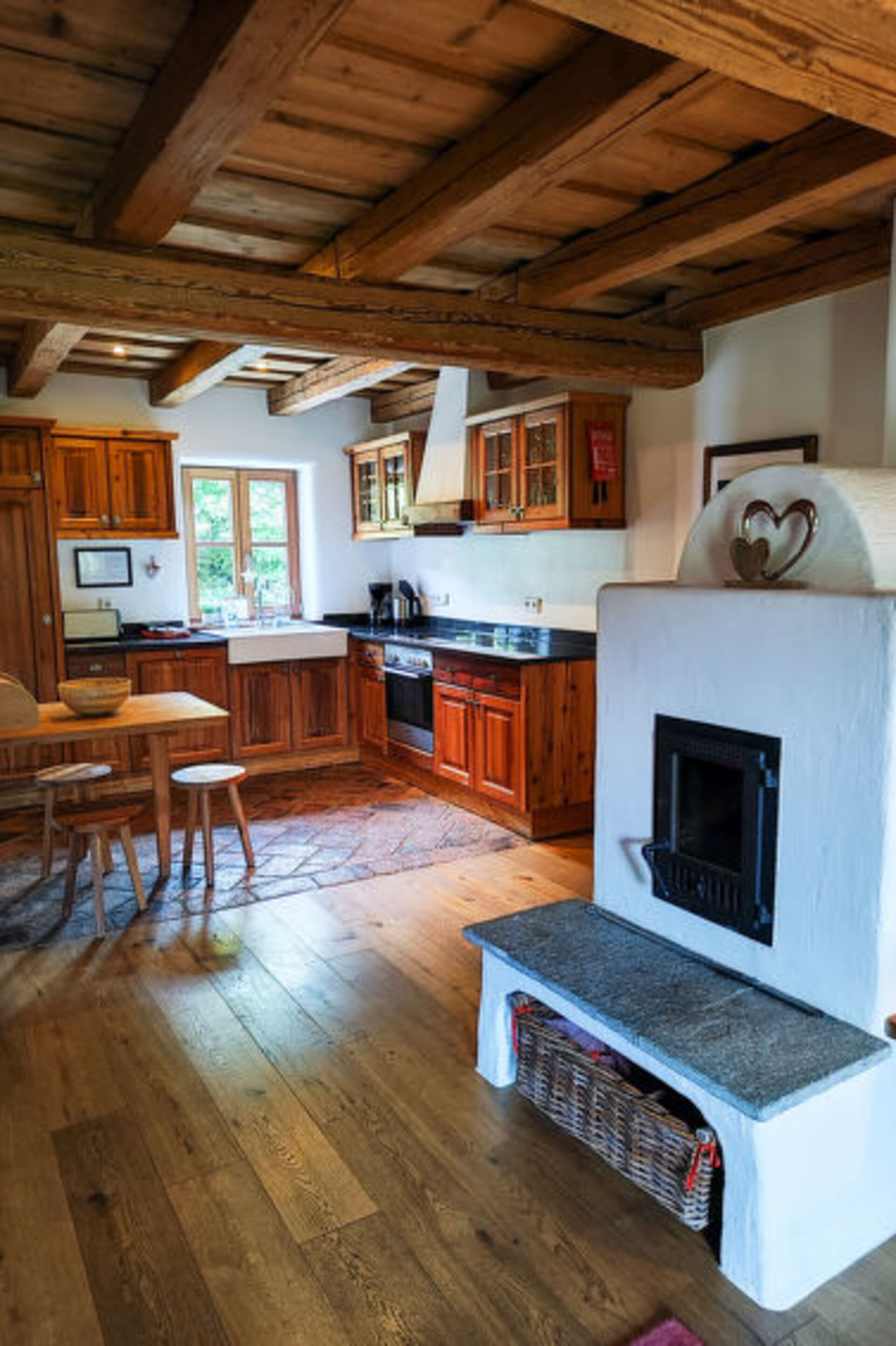 "[5startitle]", 4-room chalet 120 m2 on 2 levels. Comfortable and rustic furnishings: entrance hall. Living/dining room with open-hearth fireplace, dining nook and cable TV. Open kitchen (oven, dishwasher, 4 ceramic glass hob hotplates, toaster, kettle, electric coffee machine). Sep. WC. Upper floor: 2 double bedrooms. 1 room with 2 beds (90 cm, length 180 cm). Bath/WC, shower/WC. Underfloor heating. Wooden floors, parquet floors. Beautiful view of the countryside. Facilities: Internet (WiFi, free). Reserved parking (roofed) at the house. 2 pets/ dogs allowed.