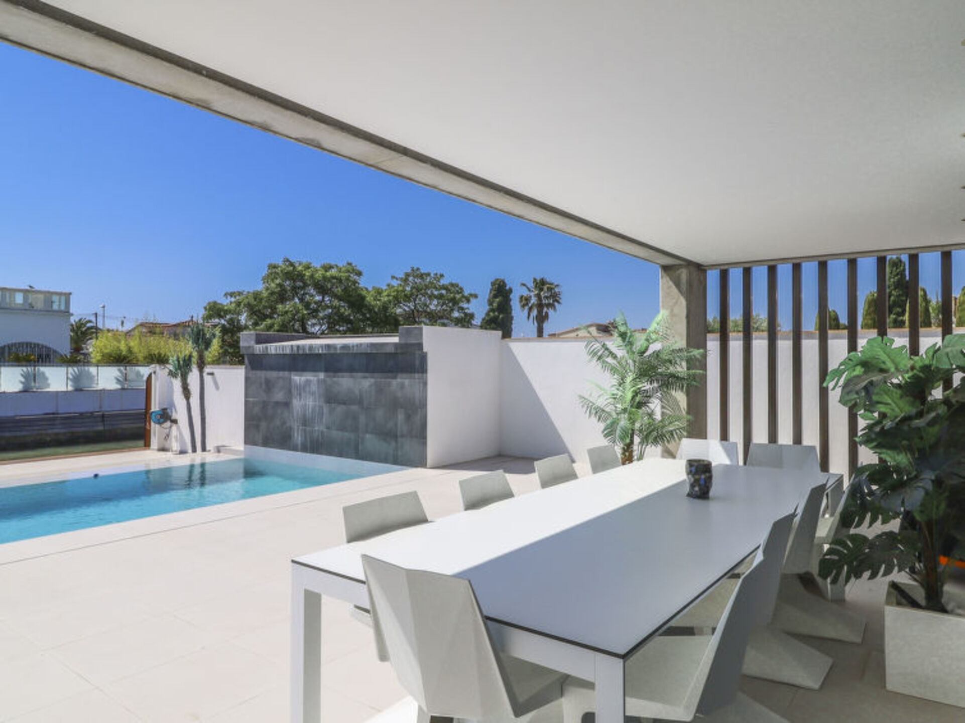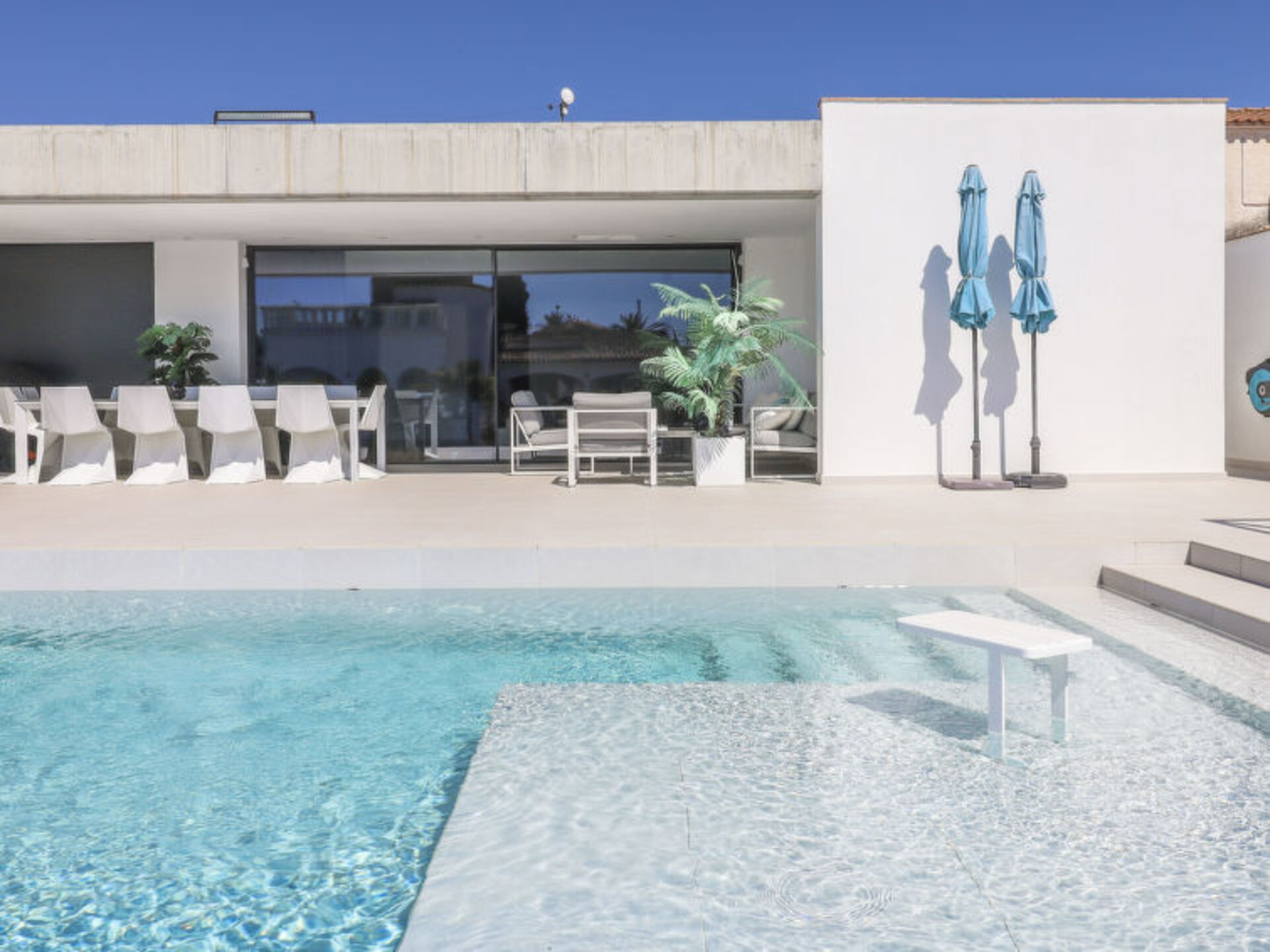 Casa al canal: Modern, comfortable, luxurious single-family house "[5startitle]". In the district of Medes 1 km from the centre of Empuriabrava, in a quiet, sunny position residential area (villas), traffic calmed area, 900 m from the sea, directly by the canal, in a cul-de-sac. Private: property (fenced), swimming pool (8 x 5 m, 40 m2, depth 50 - 160 cm, seasonal availability: 01.Apr. - 30.Oct.) with salt-electrolysis pool-cleaning system. Unconventional pool shape. Terrace, garden furniture. In the house: central heating system, air conditioning. Parking (for 2 cars) on the premises, single garage. Supermarket 1 km, restaurant 600 m, pedestrian zone 500 m, bicycle rental 1.5 km, pub garden 1 km, railway station "Figueres" 18 km, sandy beach "La Rubina / Empuriabrava" 900 m. Sports harbour 2 km, golf course (18 hole) 15 km, surf school 1.5 km, sailing school 1.5 km, tennis 1.5 km, minigolf 900 m, riding stable 800 m, sports centre 1 km, walking paths from the house 300 m, cycle lane 100 m. Nearby attractions: Parque Acuático Roses 5 km, Museo Dalí Figueres 12 km, Ruinas de Empuries 20 km, Castillo y Festival de Perelada 12 km, Centro de Paracaidismo y Túnel de viento 1 km, Cadaqués y Cap de Creus 23 km. Please note: groups of teenagers on request only. Private mooring, on request.