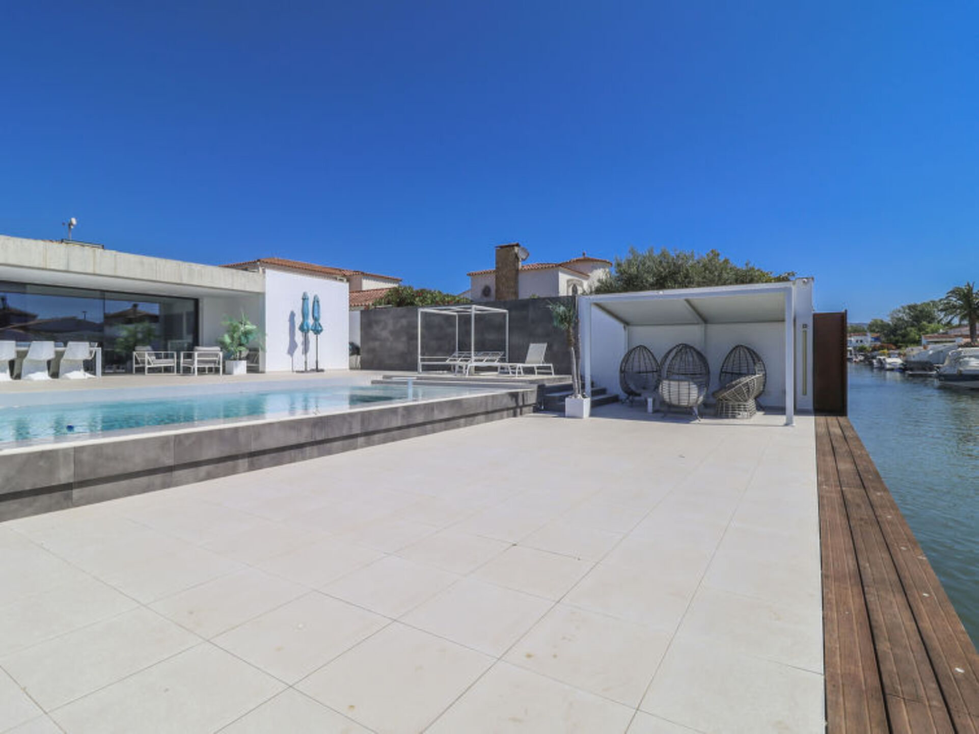 "[5startitle]", 5-room house 150 m2, south facing position. Spacious and bright, fully renovated, modern and luxurious furnishings: large living/dining room with dining table, satellite TV, air conditioning, forced-air heating and electric shutters. Exit to the terrace, to the swimming pool, south facing position. 1 room with 1 french bed (145 cm, length 190 cm), air conditioning, forced-air heating and electric shutters. 1 large room with Dressing room with 1 french bed (150 cm, length 190 cm), bath/shower/WC, air conditioning, forced-air heating and electric shutters. Exit to the terrace, to the swimming pool. 1 room with 1 french bed (150 cm, length 190 cm), air conditioning and forced-air heating. 1 room with 1 french bed (150 cm, length 190 cm), air conditioning, forced-air heating and electric shutters. Large kitchen (oven, dishwasher, 3 induction hot plates, toaster, kettle, microwave, freezer, electric coffee machine, cooking island). Shower/WC. Large terrace, large patio. Terrace furniture, deck chairs. Very beautiful view of the canal. Facilities: washing machine, dryer, iron, hair dryer. Internet (WiFi, free). Reserved parking (2 cars), garage on the property (1 car). Please note: non-smoking house. Private mooring. TV only FR, DE, ES. [5startitle]