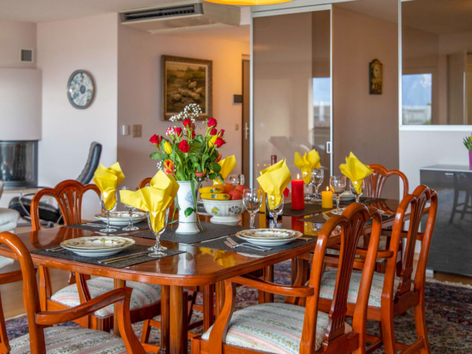 "L'Esplanade A1.4", 5-room apartment 214 m2 on 1st floor. Luxurious and tasteful furnishings: large living/dining room with open-hearth fireplace (only for decoration), cable TV, DVD, gas heating, air conditioning and electric shutters. Exit to the terrace. 1 large room with 1 double bed (160 cm, length 200 cm), bath/shower/WC and air conditioning. 1 large room with 2 beds (90 cm, length 200 cm), bath/shower/WC and air conditioning. 1 room with 2 beds (90 cm, length 200 cm), air conditioning. 1 room with 1 bed (90 cm, length 200 cm). Office. Kitchen (oven, dishwasher, 4 ceramic glass hob hotplates, toaster, kettle, microwave, freezer, electric coffee machine, Capsules for coffee machine (Nespresso) extra). Shower/WC, bath/shower/WC. Terrace 18 m2. Terrace furniture, deck chairs (2). Beautiful view of the lake, the mountains, the countryside and the resort. Facilities: washing machine, dryer, iron, hair dryer. Internet (WiFi, free). Garage space n 85, height 190 cm. Please note: non-smokers only, parking space for small car only.