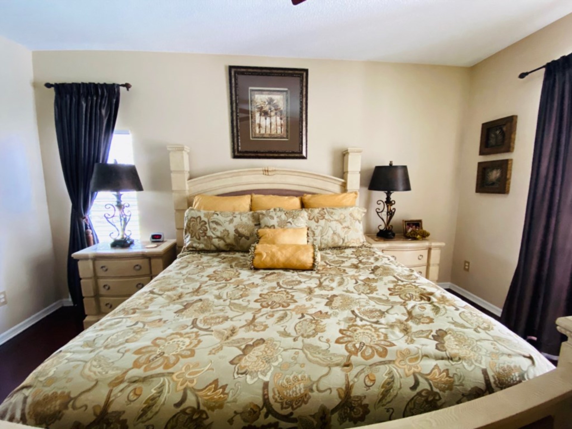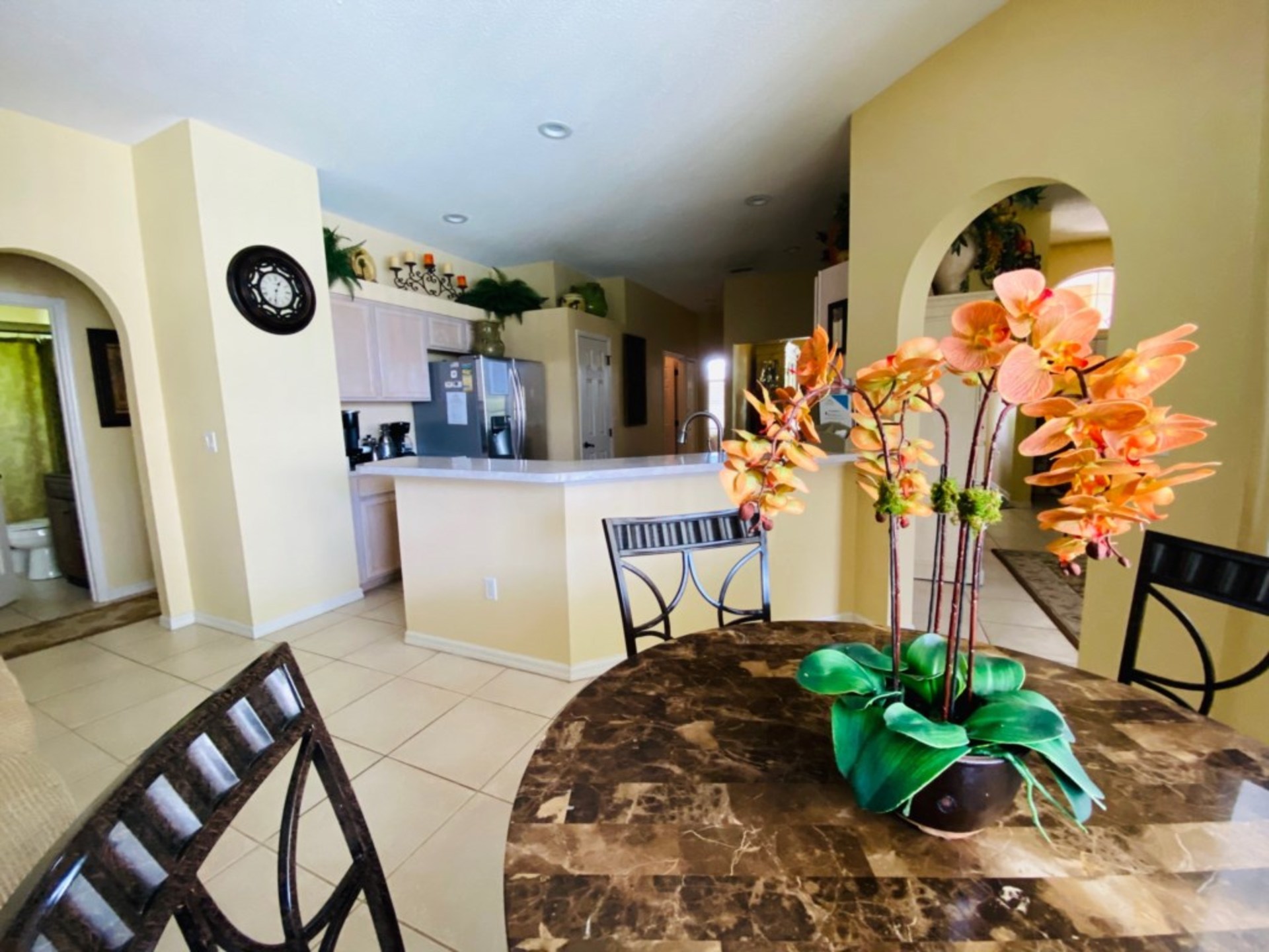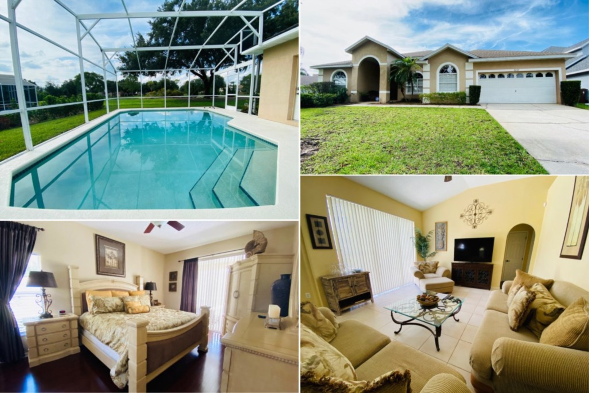 This is the perfect place for everyone to come together and enjoy a meal. There are two living room areas. Jus at the entrtance, there is a living area that has a confortable sofa, a large TV, and pair of glass patio doors that lead to the pool area. Next to the kitchen, the other main living area is big and has 2 tan sofas, an overstuffed armchair, and a large flat screen TV with a glass patio door that allows sunlight and access to the large pool area . Having two living areas is great because now there will be less fighting over the TV remote since there are two TV’s in two separate living areas. Head outside to the screened-in pool area, and you’ll find a large pool to swim in, sun loungers to sunbathe on, and a patio table and chairs to relax on with your favorite ice-cold beverage. There are also views of the golf course from the pool area. If you want some indoor entertainment, head to the games room in the converted garage. Here, you’ll find a pool table and hours of fun to be had. Did we mention there is Wi-Fi in this house?