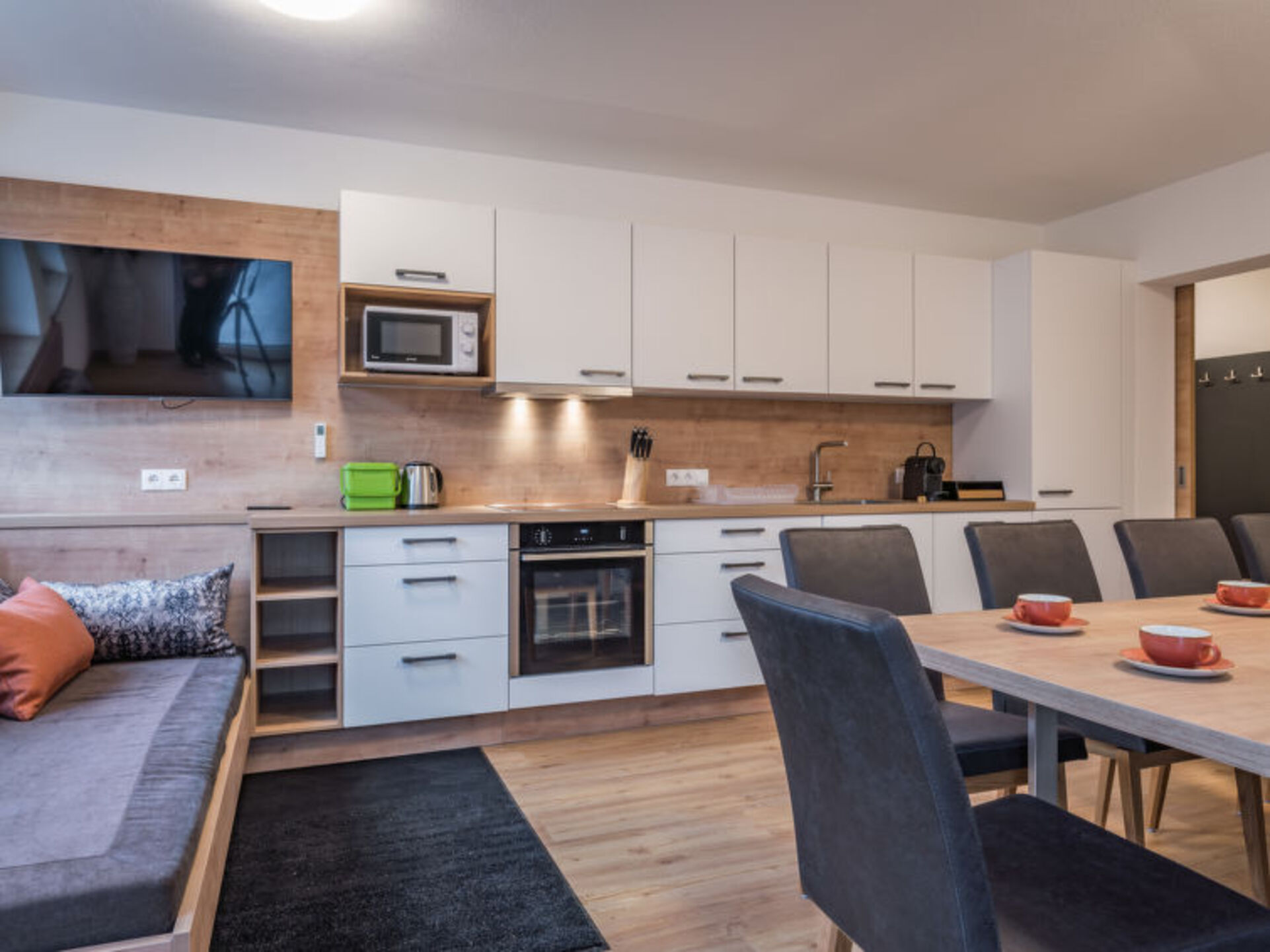 8-room apartment 200 m2 on 2 levels. Beautiful and modern furnishings: large living/sleeping room with 1 pull-out bed and satellite TV. 1 large double bedroom with 1 double bed and satellite TV. 1 large room with 1 bed, 1 double bed, shower/WC and satellite TV. Alcove with 1 pull-out bed (2 pers.). 1 large room with 1 bed, 1 double bed, shower/WC and satellite TV. 1 large room with 1 bed, 1 double bed and satellite TV. 1 large double bedroom with 1 double bed, shower/WC and satellite TV. Large kitchen-/living room (oven, 4 ceramic glass hob hotplates, toaster, kettle, freezer, electric coffee machine). 2 showers/WC. Heating. Large terrace 50 m2, large terrace 20 m2. Terrace furniture, barbecue. Very beautiful panoramic view. Facilities: Internet (WiFi). Reserved parking (5 cars). Electric vehicle charging station. Please note: suitable for families. Non-smokers only. 1 pet/ dog allowed. There are two comparable eat-in kitchens, each with a sofa bed.