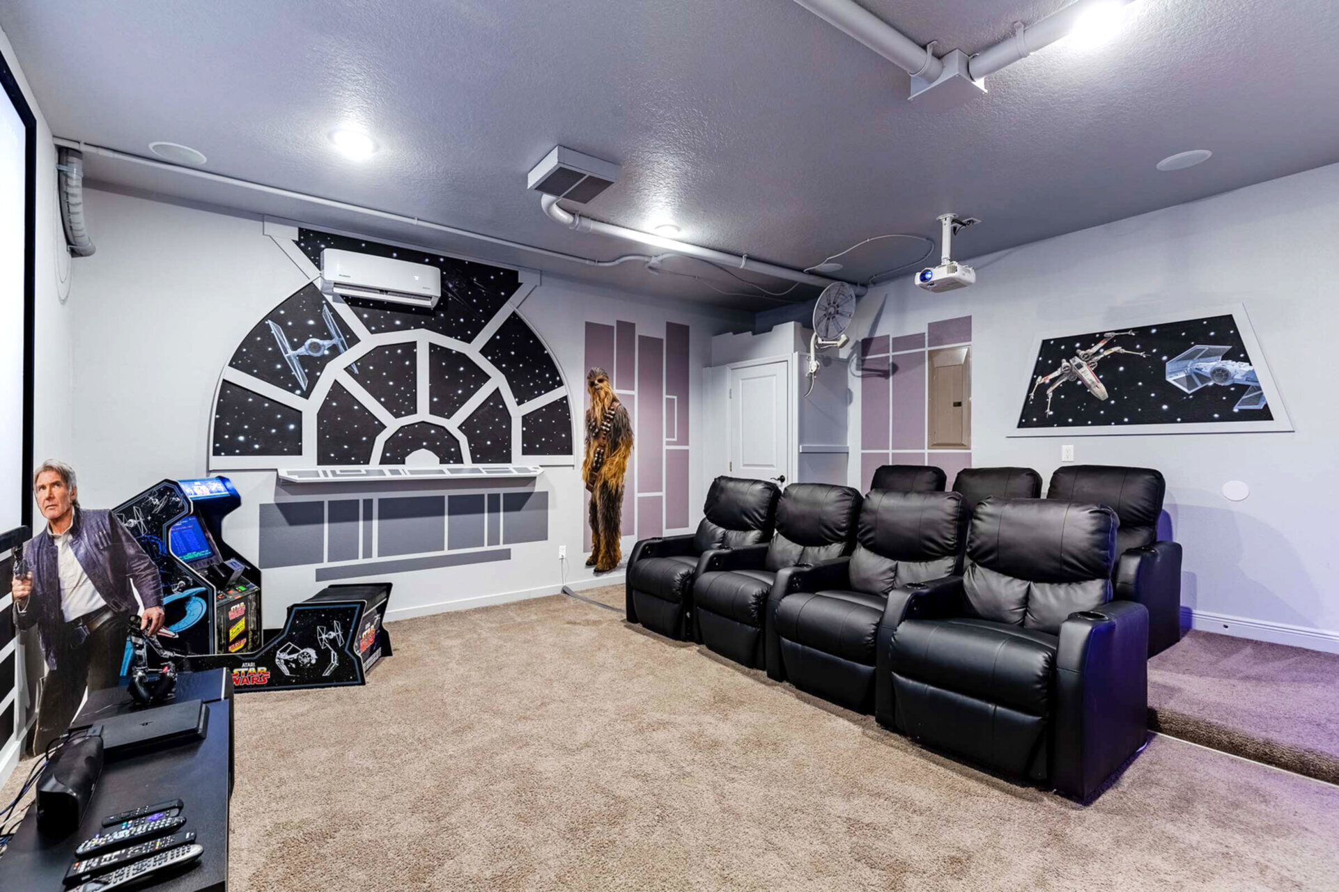 Head through the large sliding doors to soak up all the Florida sun in the private pool and spillover spa. The pool area features 4 sun loungers, sofa, chairs perfect to relax and a fenced-in pool with a self-closing door. You can also dine al' fresco with a meal straight off the built-in BBQ grill and outdoor dining table with seating for 6. If looking for more relaxation, then head towards the custom theater/game room located on the first floor. The custom theater/game room features theater seats for 7, perfect to host a movie night. It also has a Star Wars Trilogy Arcade game to keep everyone entertained.