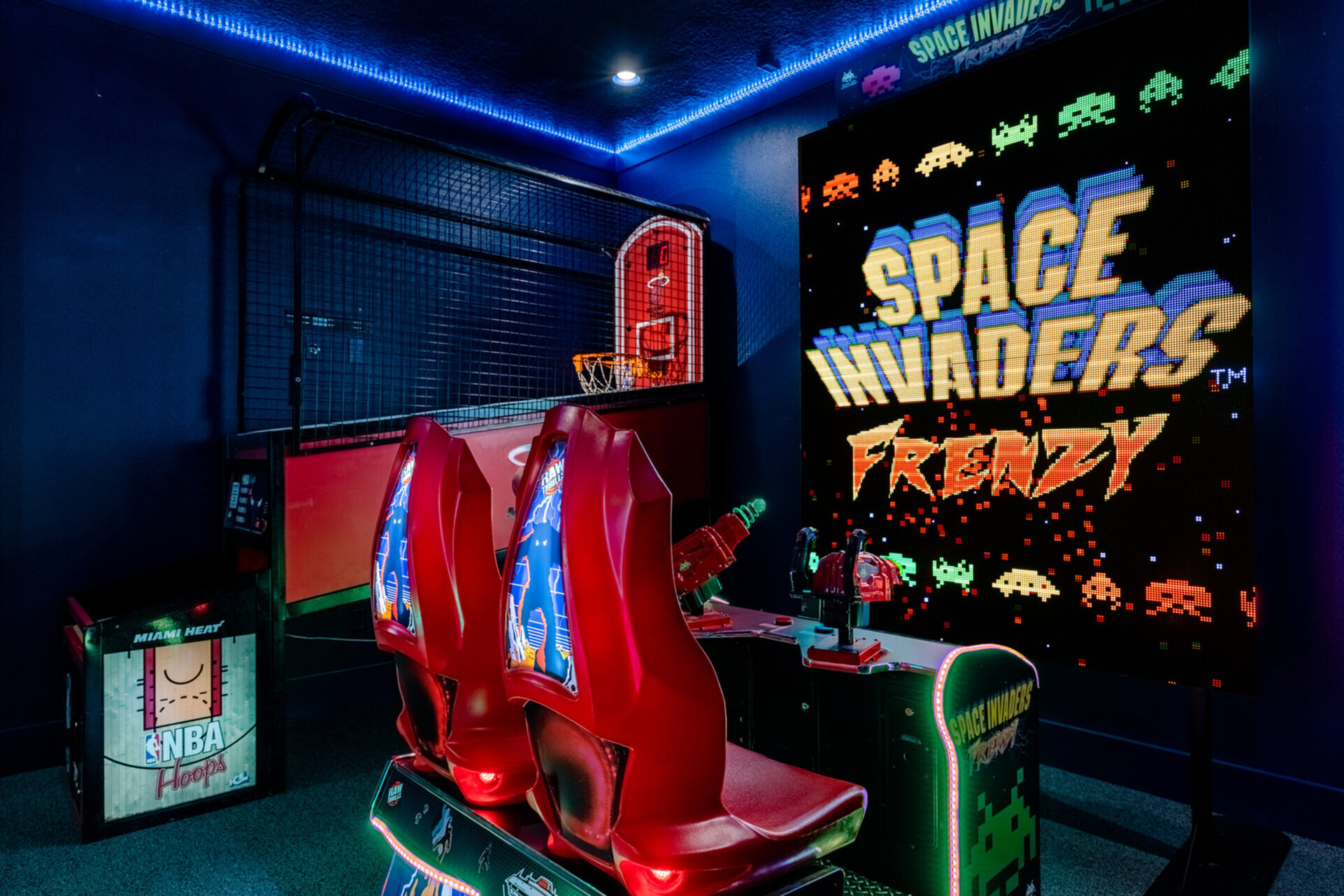 Back inside the home, find endless entertainment in the ground floor games room! Inside the game room, guests will find NBA Hoops, Space Invaders, Golden Tee and Cruisin' Blast. Upstairs, you'll discover the private home theater room. Make some popcorn at the wet bar, sit back in one of the 6 reclining theater seats and enjoy a night at the movies without even leaving your home.