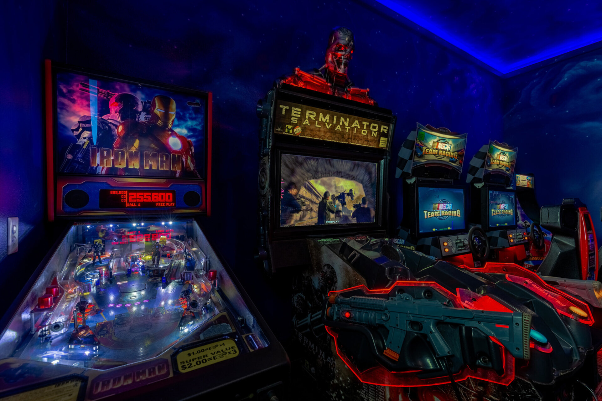 Amongst the extravagance of the sophisticated style of the villa, step into a new galaxy game room complete with two driving games, Terminator shooting game, multi-game arcade, Ironman pinball, and air hockey table. If that's not enough, sit down and play PS4 or Xbox on the two 58-inch monitors. LED lights encircle the room and behind the two monitors.