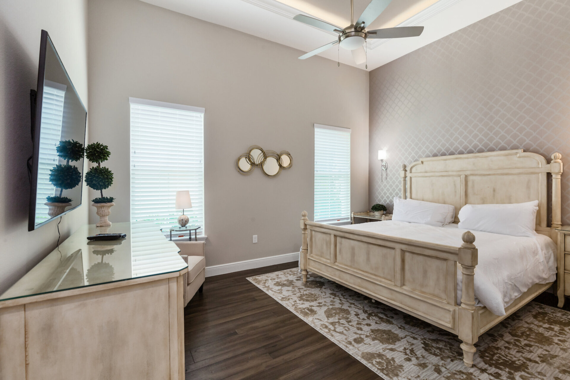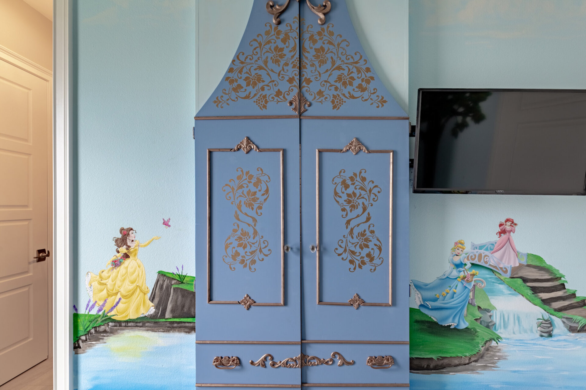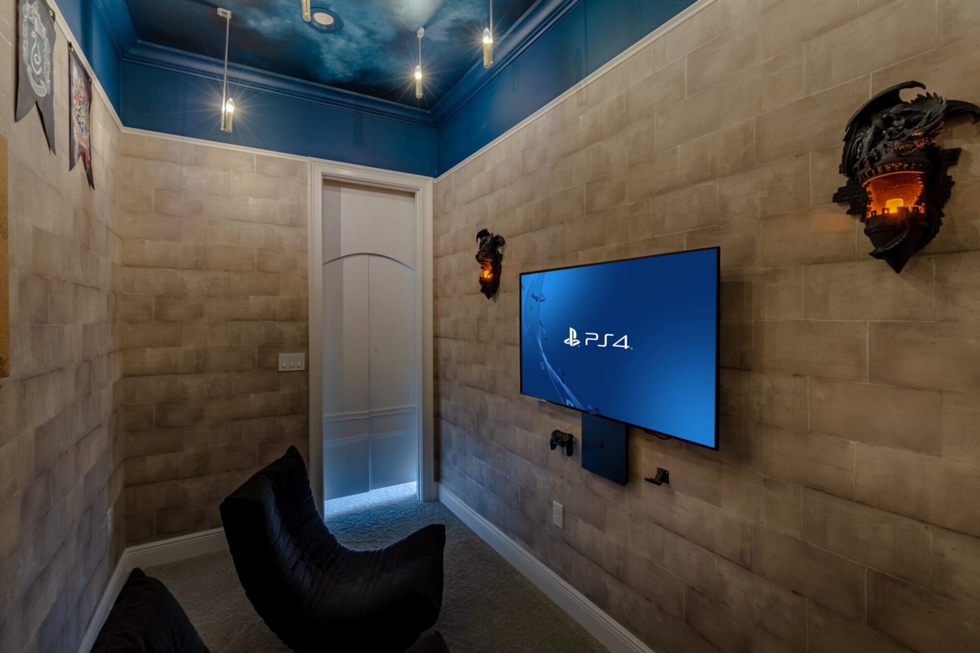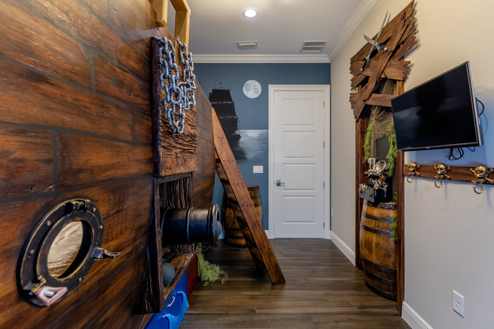 This villa has 7 bedrooms in total, with 2 incredible custom-built children's bedrooms. Your little pirates will be shouting anchors away in this nautical bedroom, featuring a pirate ship with 2 full-sized beds. Sail right into the connected secret playroom that has a large flat-screen TV for kids to watch movies or play PS4 games on. The secret room features floating candles from the ceiling so kids will feel like they've entered a world of magic. For those who want a more majestic slumber, on the opposite side of the playroom is the customized princess castle bedroom. Climb into the castle and cozy up in one of the two full-sized bunk beds. A jack and jill bathroom is shared between both bedrooms, with two vanities designed to fit each bedroom's theme.