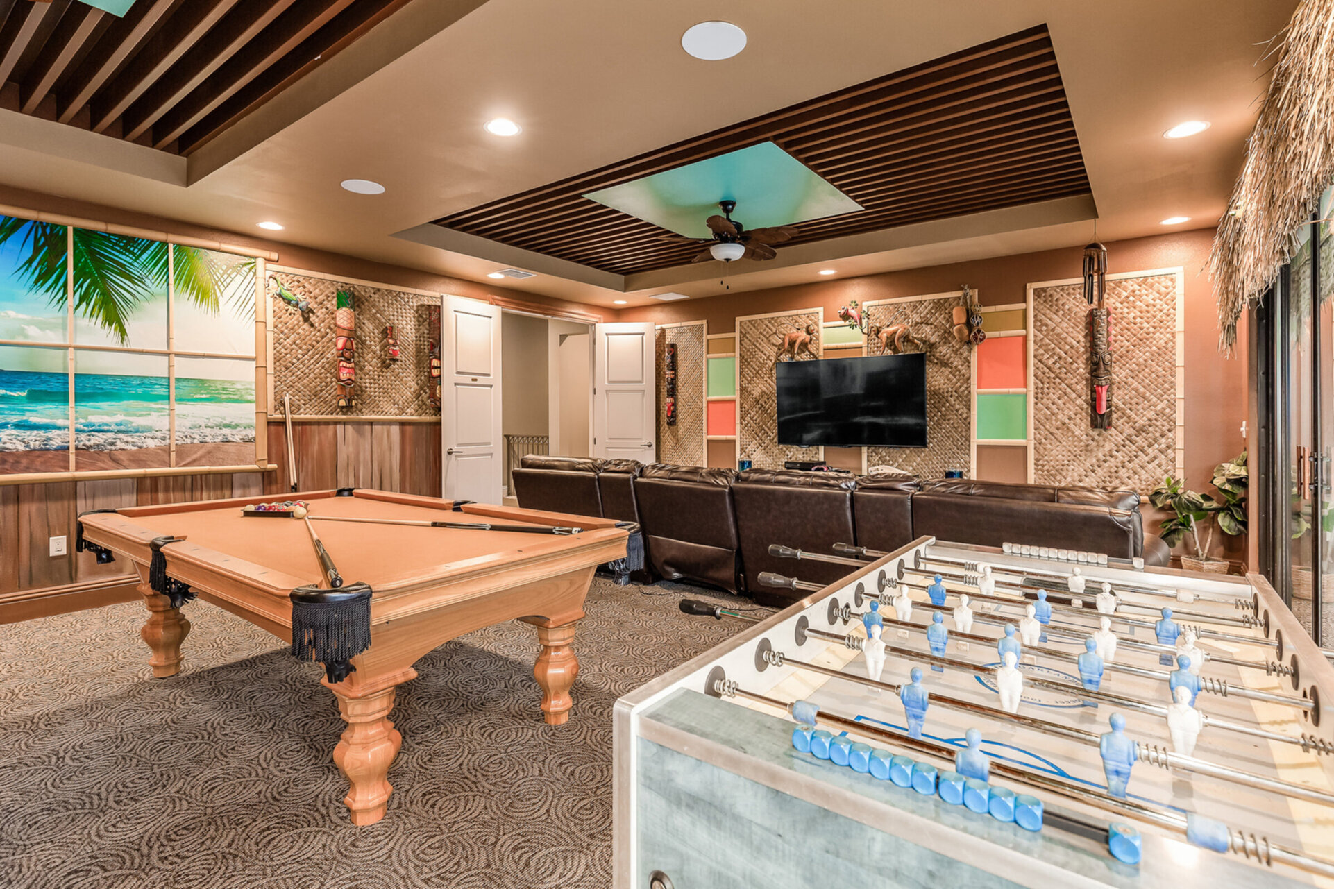 Slide open the patio doors for your own private oasis. The pool area features a custom-built pool with a spillover spa and waterfall. Lounge and take in the Florida sun on one of the 8 sun loungers. Grill up lunch at the summer kitchen. Serve your meal family-style at the outdoor dining table with seating for up to 8 guests and an extra sitting area. There is no lack of entertainment in this home! The converted garage game room has fun for all ages! The garage features 2 racing arcades, a basketball arcade, shooting arcade, and an air hockey table. Head upstairs to the upstairs loft for more traditional entertainment!