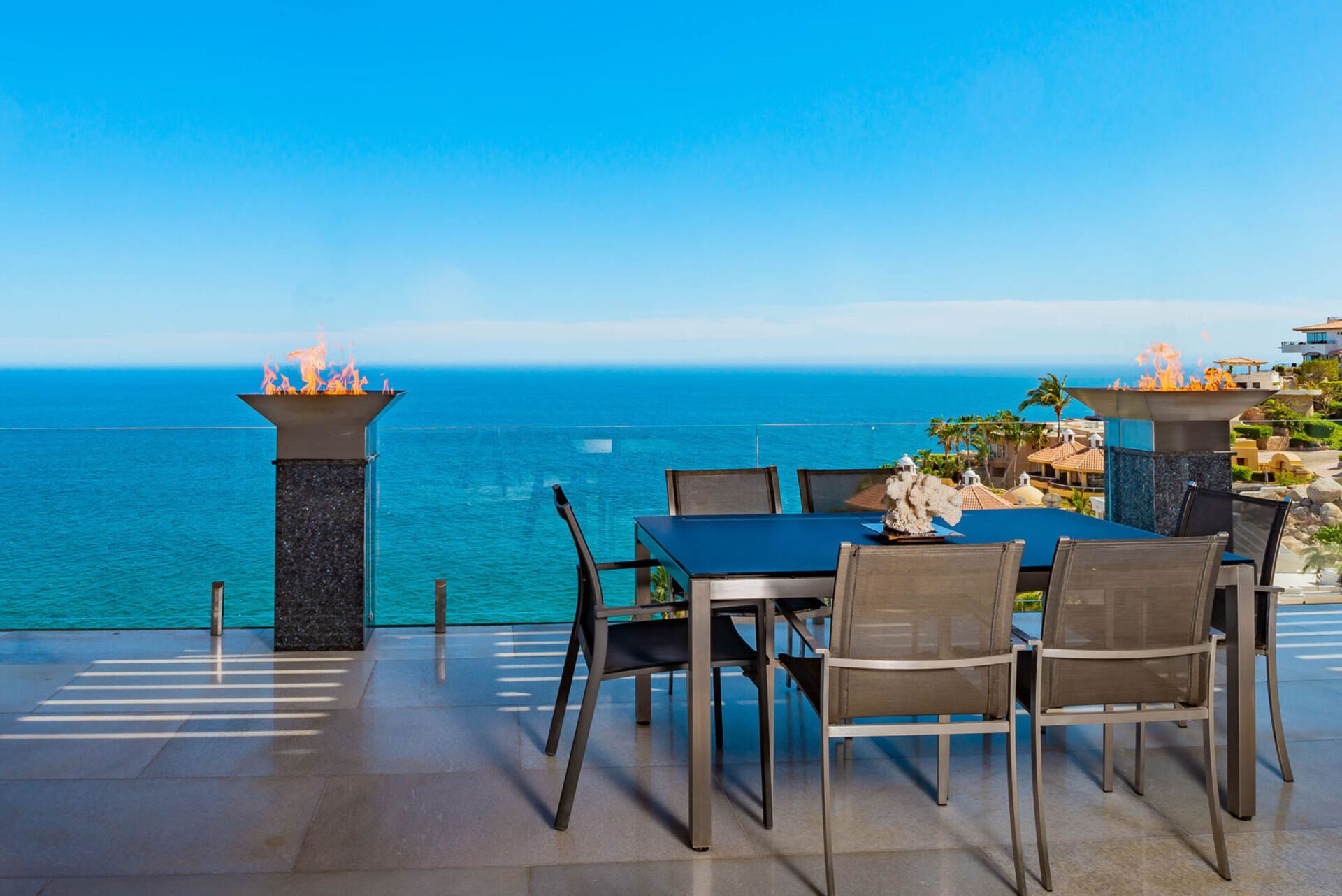 The villa’s expansive outdoor space offers three levels of patios, each designed to take full advantage of the spectacular ocean views.